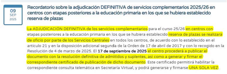En la fecha establecida (varía cada año, ver "Calendario de los SSCC" en Calendarios de actuaciones) se procederá a la adjudicación definitiva, que será firmada digitalmente y publicada en el tablón de anuncios del centro (artículo 21.8 de la Orden de 17 de abril de 2017).